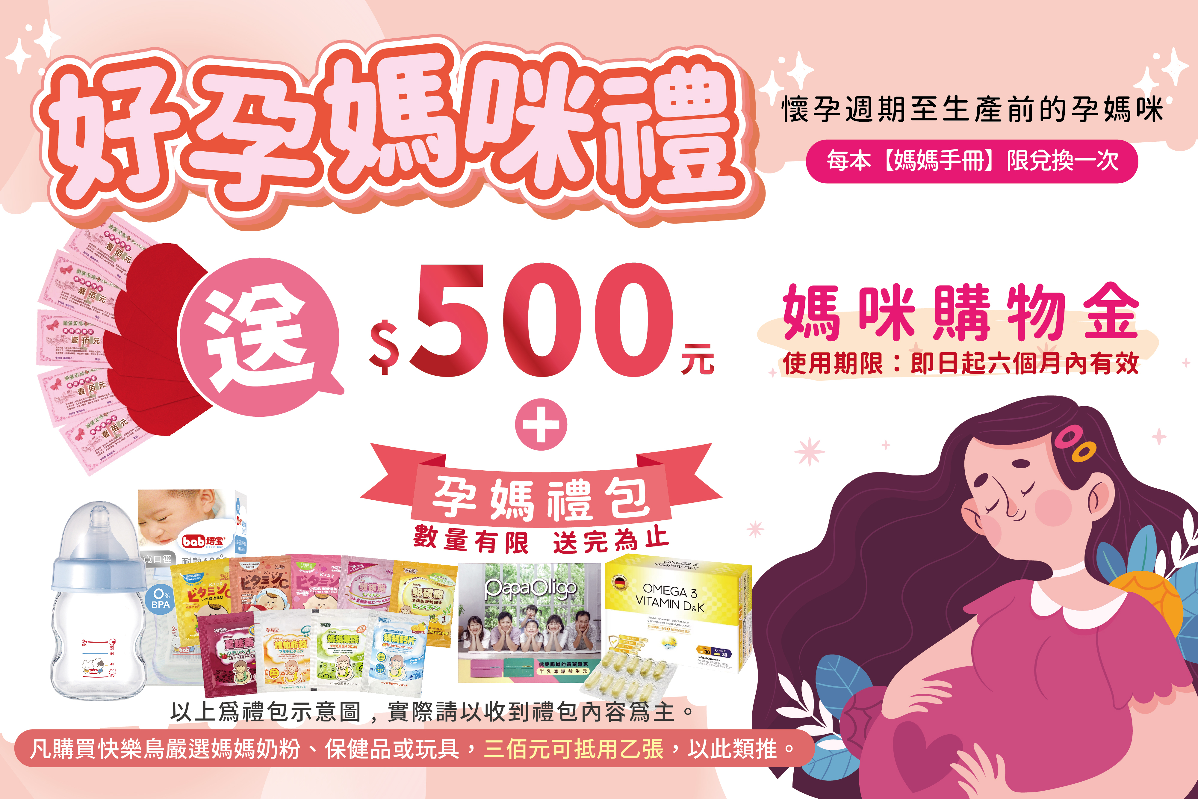 兌換僅限於門市,百貨專櫃門市不參與媽咪寶貝禮活動。詳請請洽快樂鳥藥局門市人員!