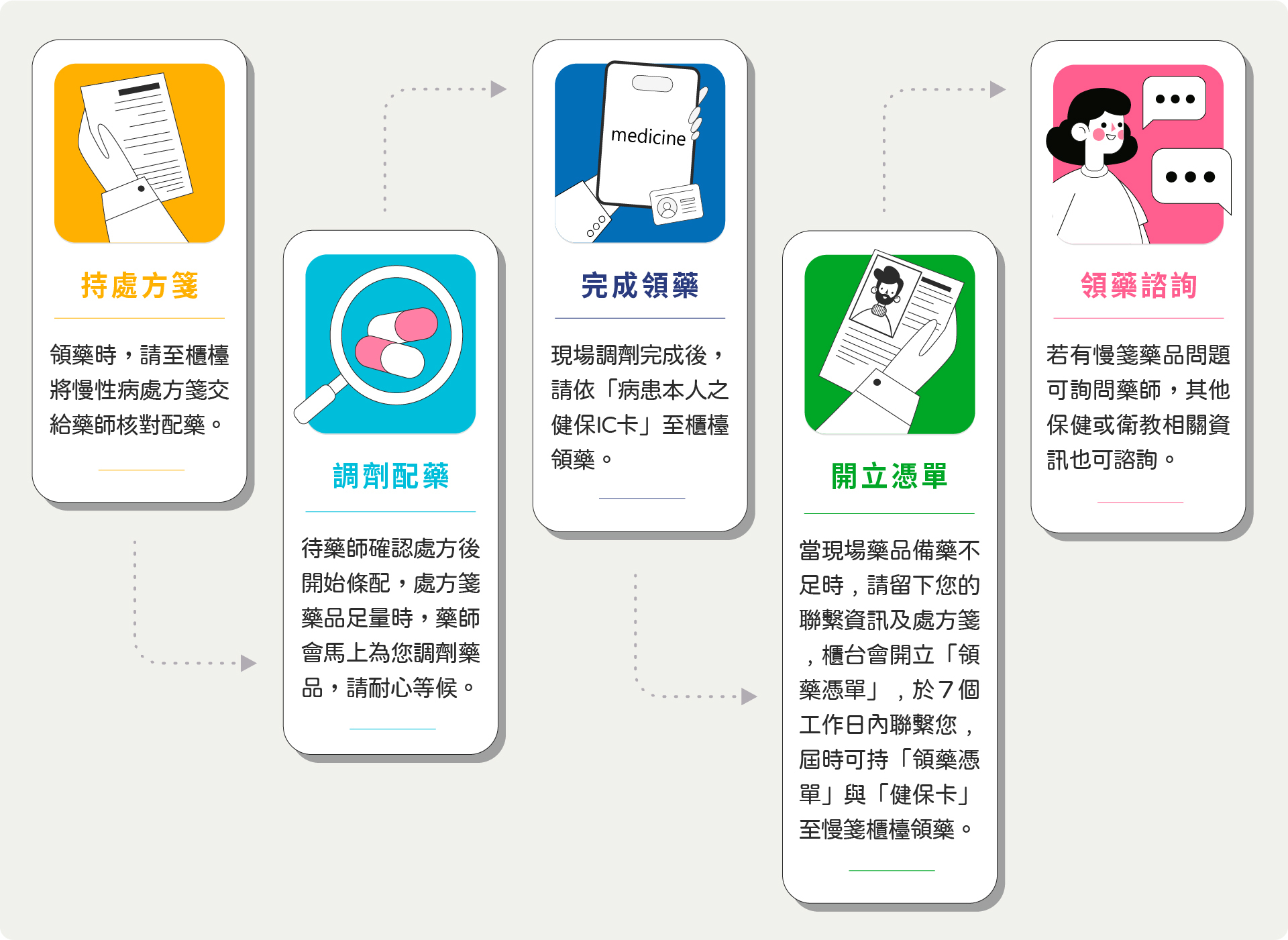 按領藥日期,攜帶健保卡及慢性病連續處方箋至快樂鳥連鎖藥局,快樂鳥藥師會按照處方箋配藥,安心又方便。