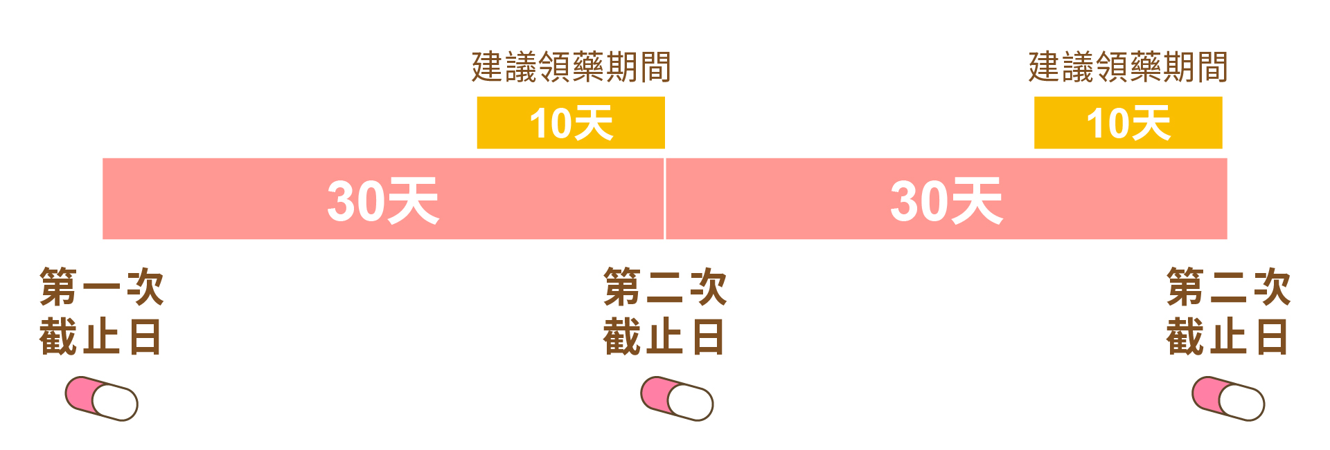 例如:1/1為第一次領藥時間,每次領30天份,於1/31服藥完畢,第二次可領藥時間為1/21~1/31日(以此類推)。