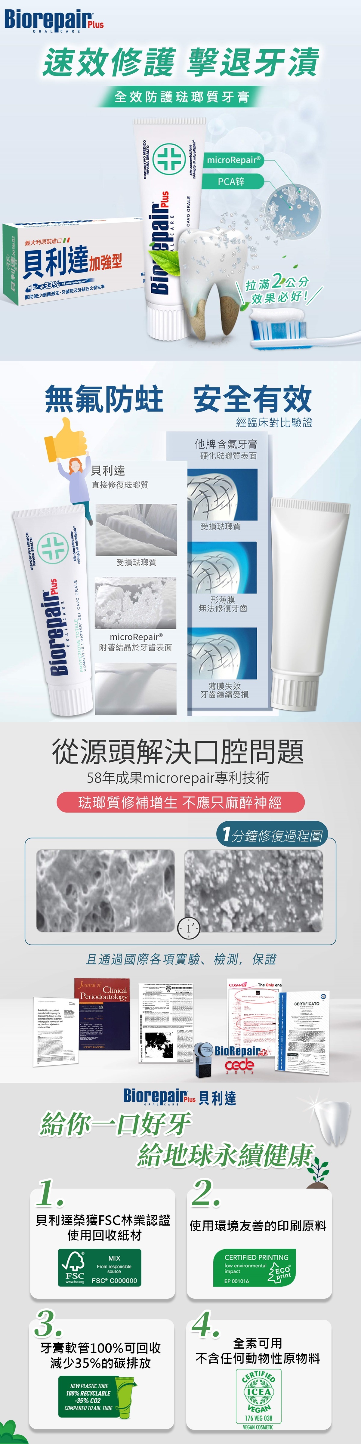 產品說明:利用高科技奈米微粒修補琺瑯質表層,保護牙齒和口腔健康,幫助預防防蛀牙,去除牙菌斑、牙結石之發生率。配方中含鋅 PCA 可加強抑菌作用。與「抗敏感加強型」共同或交換搭配使用,可加倍牙周防護效果。
