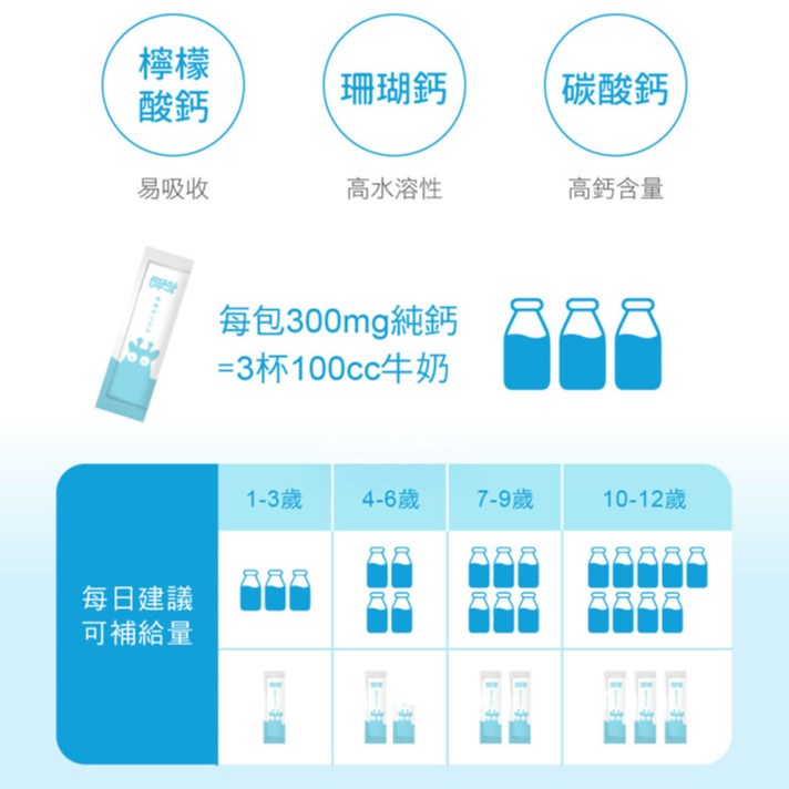 1至3歲,每日1包;4至6歲,每日1至2包;7至9歲,每日2包;10至12歲,每日3包