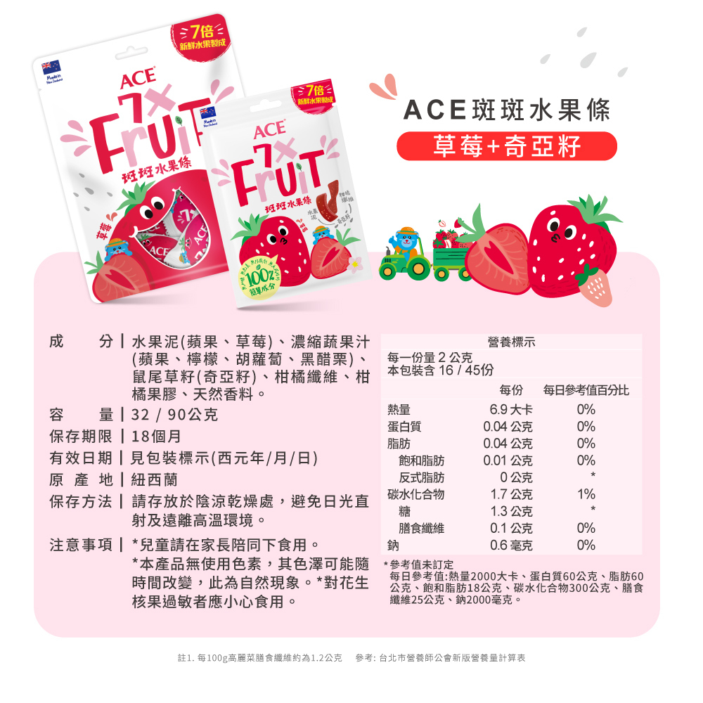 品名:ACE斑斑水果條90g/袋(共3款口味:1.百香果+奇亞籽 2.黑醋栗+奇亞籽 3.草莓+奇亞籽)