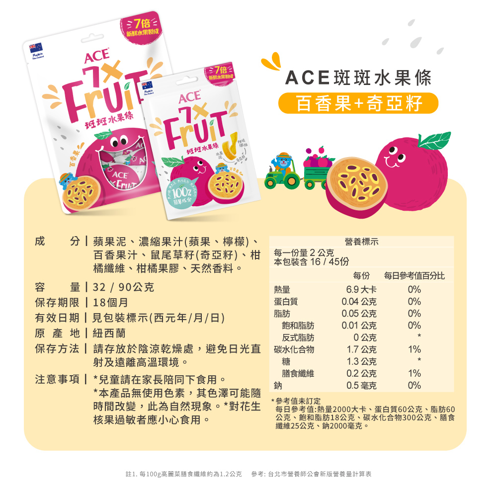 1.ACE斑斑水果條(百香果+奇亞籽)_蘋果泥、濃縮果汁(蘋果、檸檬)、百香果汁、鼠尾草籽(奇亞籽)、柑橘纖維、柑橘果膠、天然香料