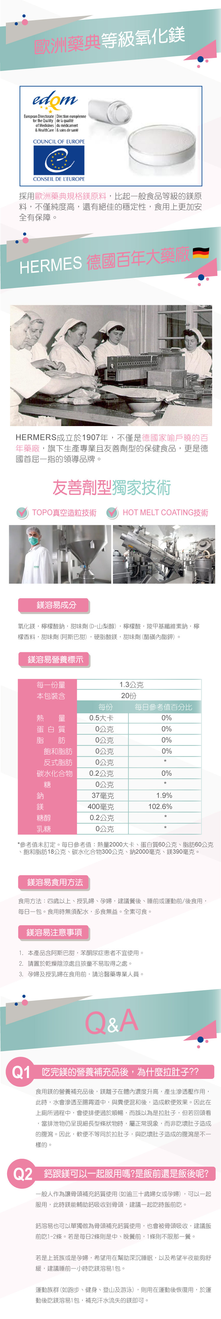 品名:HERMES愛美仕 鎂溶易口腔崩散劑型(食品)產品說明:詳細請參考官網或包裝說明,不提供成分及效果說明。容量:20入裝/盒產地:德國有效日期:標示於包裝瓶底(西元年/月/日),效期依每批進貨,非短效即期商品。保存方式:保存於陰涼乾燥處,避免陽光直射,並置於孩童無法取得處。食用方式:四歲以上、授乳婦、孕婦,建議餐後、睡前或運動前/後食用,每日一包。