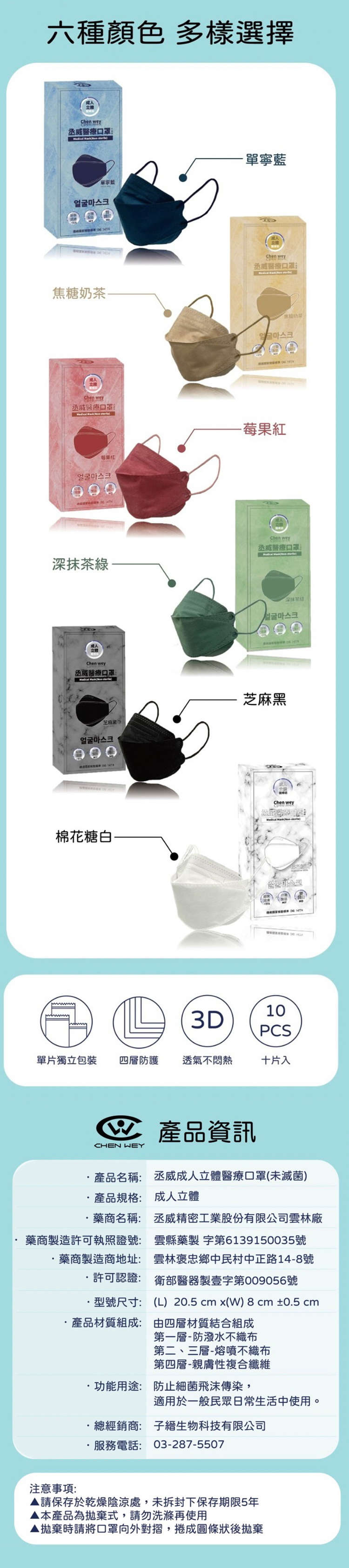 產品名稱:丞威成人立體醫療口罩(未滅菌)包裝:10片入/盒尺寸:20.5 x 8cm±0.5cm (一般成人尺寸)四層材質結構:第一層-透氣無紡布第二層-熔噴不織布第三層-熔噴不織布第四層-親膚無紡布藥商製造商:丞威精密工業股份有限公司 雲林廠藥商製造商地址:雲林縣褒忠鄉中民村中正路14-8號許可認證:衛部醫器製壹字第009056號製造證號:雲縣藥製 字第6139150035號