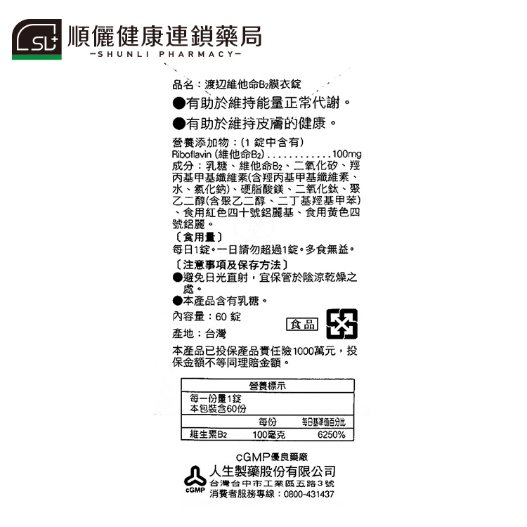 品名:渡邊維他命B2主成分:乳糖、維他命B2、二氧化矽、羥丙基甲基纖維素(含羥丙基甲基纖維素、水、氯化鈉)、硬脂酸鎂、二氧化鈦、聚乙二醇(含聚乙二醇、二丁基羥基甲苯)、食用紅色四十號鋁麗基、食用黃色四號鋁麗基內容量:60粒/瓶用法用量:成人(15歲以上)一天食用1錠,於飯後用開水或溫開水一同食用,多食無益。保存方法:請置於陰涼、乾燥處,避免陽光直接照射,食用後,請關緊瓶蓋,以避免受潮。