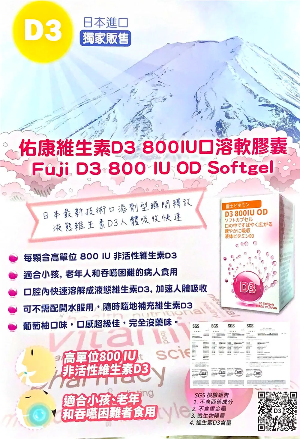 ▸營養標示品名:佑康維生素D3-800IU 口溶軟膠囊內容量 : 90粒入/盒用法用量 : 每日1粒,多食無益產地 : 日本 富士カプセル株式会社 藥廠保存期限:見盒上標示有效年限:3年代理商:佑康生醫科技有限公司備註:商品圖文顏色可能因螢幕設定差異會略有不同,以實際商品為主。