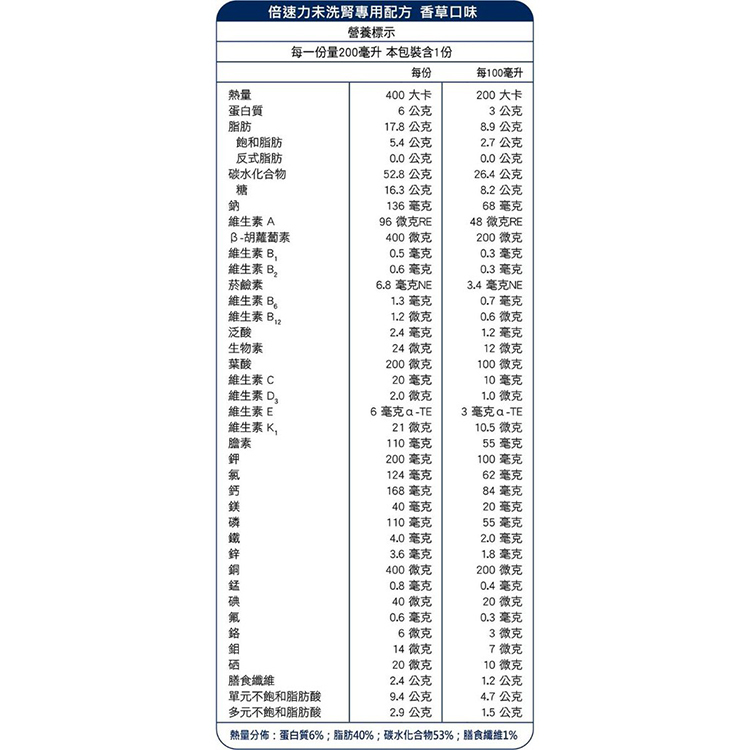 產品適用對象※ 未洗腎之第3期至第5期慢性腎臟病患者。※ 未洗腎之急性腎臟病患者僅適用非異化代謝狀態(non-catabolic condition)廠商名稱:台灣費森尤斯卡比股份有限公司廠商電話:(02)27551996廠商地址:台北市仁愛路三段32號5樓食品業者登錄字號:D-200009076-00000-4備註:商品圖文顏色可能因螢幕設定差異會略有不同,以實際商品為主。