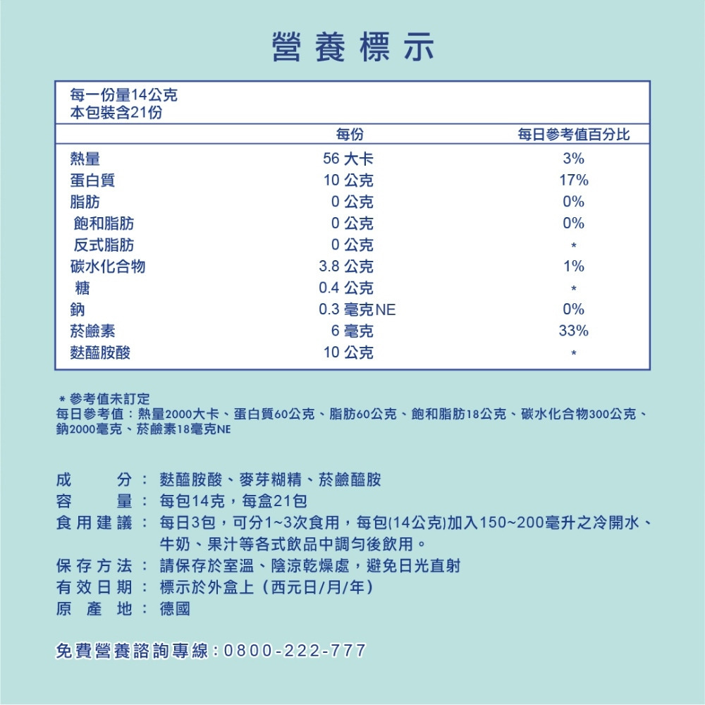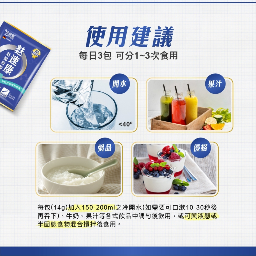 食用方式:每日3包,可分1-3次食用,每包14g加入150-200毫升之冷開水、牛奶、果汁等各式飲品中調勻後飲用