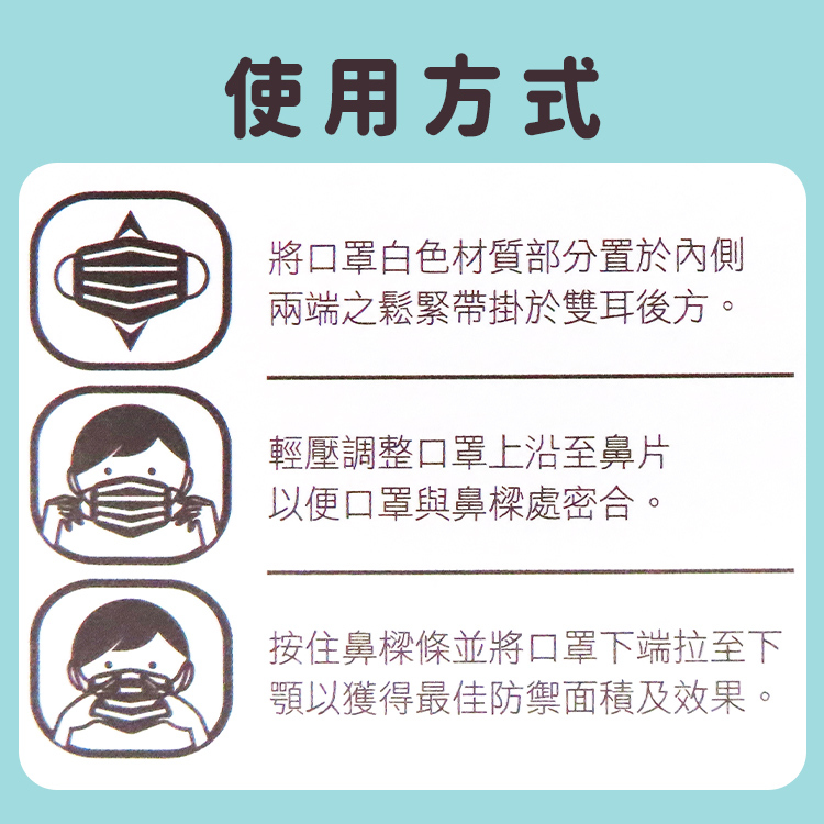※本產品為一次性拋棄型口罩,請勿洗滌再重複使用。