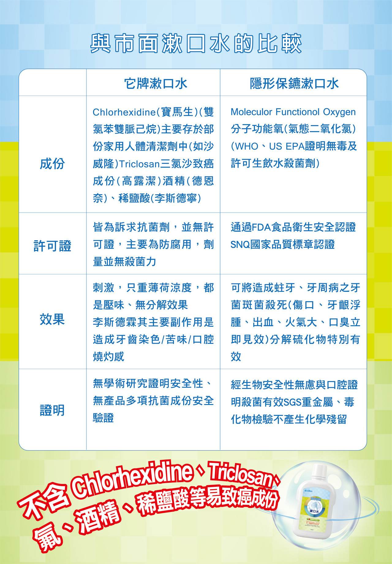 不含Chlorhexidine、Triclosan氟、稀鹽酸等易致癌成份